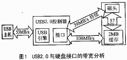以USB硬盘为例分析USB2.0的高速传输性能。图1为USB2.0与硬盘接口的带宽分析。