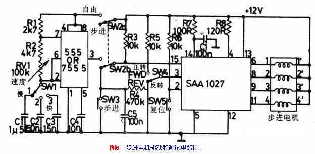 这个电路用于混和型四相步进电机,额定电流可达300mA。电机可用SW3进行手工的单步试验,或者用SW2经555/7555无稳振荡器进行自动步进的试验。SW4可控制电机的方向。SW5用于复位控制试验。