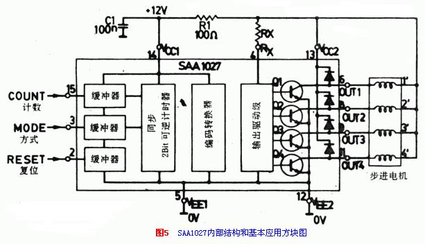 四相步进电机可用几种专用的集成电路驱动器,SAAl027是其中常用的一种,它的特点是工作电压范围宽9.5V~18V;输出驱动电流大,可达500mA。它适合作四相全步步进电机的控制。图4是SAAl027的外形和引脚功能图。图5(下面↓)是它的内部原理方块图及基本应用。