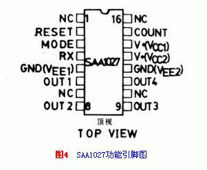 SAA1027集成电路有三个输入控制端:计数、方式和复位。复位端通常是高电平。计数器每次从低电平到高电平的跳变,将使集成电路改变状态。全部的