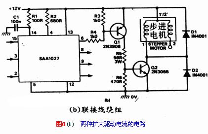 如果希望把电流扩展5A,则采用图8中的两个电路。步进电机的每相都需要外加驱动电路,一个四相步进电机,需要增加四个这样的附加电路。图8(a))的电路用于驱动电路,一个四相步进电机,需要增加四个这样的附加电路。图8(a)的电路用于驱动四个完全独立的绕组。图8(b)的电路用于绕组具有公共点步进电机。D1和D2的作用是防止电机的反电动势损坏输出级晶体管。