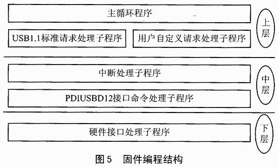 为了不影响程序的执行效率,本方案采用中断方式完成固件的编写;同时,为了保证程序的模块化及良好的可移植性,在设计中采用分层结构进行固件的编写,如图5所示。