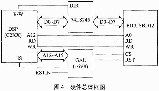 对其余时序上的配合,经过仔细的计算与核对证明,也是完全可行的。在硬件上,哂方案还采用了一片GAL(16V8)来实现对PDIUSBD12芯片的片选,以及实现对它的软件和手动复位。硬件总体框图如图4所示。