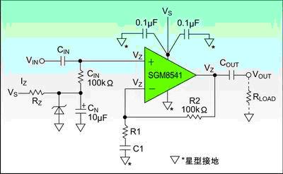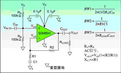首先,电路的电源抑制几乎没有,电源电压的任何变化都将直接通过两个分压电阻改变偏置电压Vs/2,但电源抑制的能力是电路非常重要的特性。例如此电路的电源电压1伏的变化,能引起偏置电路电压的输出Vs/2变化0.5伏。该电路的电源抑制仅仅只有6dB,通过选用SGM8541运算放大器可以增强电源抑制能力。
