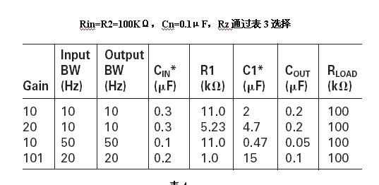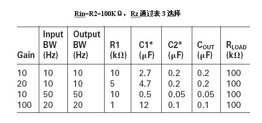 设计单电源运算放大器电路,需要考虑输入偏置电流误差、电源抑制、增益、以及输入与输出线路带宽等等。然而普通的应用设计是可以通过查表来获得,见表1。在单电源电压为15V或12V时偏置分压的两个电阻通常选用100kΩ,这样可以在电源消耗与输入偏置电流误差之间合理的折中。5V单电源偏置分压电阻减小到一个比较低的值,例如42kΩ。还有些在3.3V应用中偏置分压电阻选在27kΩ左右。