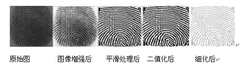 (4) 指纹图像细化处理。图像细化就是将脊的宽度降为单个像素的宽度,得到脊线的骨架图像的过程。这个过程进一步减少了图像数据量,清晰化了脊线形态,为之后的特征值提取作好了准备。由于我们所关心的不是纹线的粗细,而是纹线的有无。因此,在不破坏图像连通性的情况下必须去掉多余的信息。因而应先将指纹脊线的宽度采用逐渐剥离的方法,使得脊线成为只有一个象素宽的细线,这将非常有利于下一步的分析。