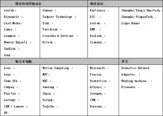 下表罗列了指纹识别产品的种类,以及正在提供这些产品的厂商。目前已经有10多种以上的设备领域开始应用指纹识别技术。