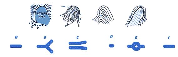 – B:分叉点(Bifurcation),一条纹路在此分开成为两条或更多的纹路