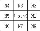 (3)指纹特征点提取。对指纹的特征信息(总体和局部的)进行选择、编码,形成二进制数据的过程。指纹特征点的提取方法是算法中的核心。一般采用8邻域法对二值化、细化后的指纹图像抽取特征点,这种方法将脊线上的点用“1”表示,背景用“0”表示,将待测点(x,y)的八邻域点(如下图所示)进行循环比较,若“0”,“1”变化有六次,则此待测点为分叉点,若变化两次,则为端点。通过这个过程可以记录下来一个指纹的所有特征点。通常一个指纹的特征点在100~150之间,在形成指纹特征值模板(也就是特征值的有序集合)时,尽量多的提取特征点对于提高准确性是有很大帮助的。