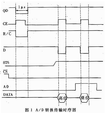 A 在/D 转换时,8253 的定时脉冲或端口写脉冲QD 经过延时和调节定时宽度后,使A/D 的使能控制CE 开始启动A/D转换。同时QD 宽度为1μs 的低电平脉冲(在端口写启动方式下,1μs 的低脉冲是由端口写脉冲经调节定时宽度后获得)使R/C的转换有效,A0 及片选CS 可在A/D 转换前设置为有效。当读取A/D 转换后的数据时,端口读信号或DMA 读信号D 直接使A/CD 的使能控制CE 启动数据读,此时R/C=1,R/C 的读有效,开始12 位数据的读取。当A0=0 时,读取高八位数据;当A0=1 时,读取数据低四位,读完后A0=0,准备下一次A/D 转换。可见该时序既能与PC 机接口,又能使AD1674 正常工作。
