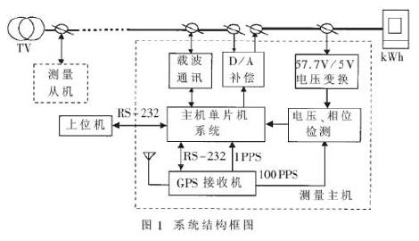 基于全球卫星定位系统(GPS)的电压互感器二次线路压降自动跟踪补偿装置能很好地解决以上问题。装置以GPS信号作为TV二次线路两端数据采集的同步信号,同步测量TV输出端口和电能表输入端口的电压向量,结合锁相倍频技术,使系统的准确性和稳定性得到保证;并以电力线载波通信的方式进行数据通信,免去了铺设电缆的麻烦和安全隐患;通过D/A转换实时进行电压补偿,从而达到自动跟踪补偿的目的。