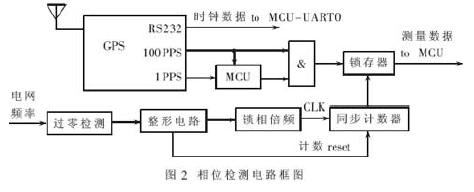 压降测量是通过分别检测TV二次线路两端的电压向量(应检测出幅值和相位),然后将两端测量值相减从而得出线路压降值的幅值差和相位差。电压的幅值测量较易满足要求,采用一般的16bit A/D变换的方法即可。而相位差的检测则是技术难点,本装置对相位的测量是通过锁相环电路将电网频率信号倍频,用该倍频信号作为计数器的时钟信号。每次电压过零时,计数器重新开始计数。通过读取TV二次线路两端计数值并计算差值从而得出相位差。其结构图如图2所示。计数器时钟信号由锁相倍频电路产生,电压过零检测产生的信号经过整形后作为计数器的开始计数信号,GPS的100PPS脉冲在单片机控制信号的作用下对计数器当前值进行锁存,每个周期的相位采样数据(从锁存器读)、GPS接收机1PPS信号以及它的时钟标签同时被送至单片机进行处理。