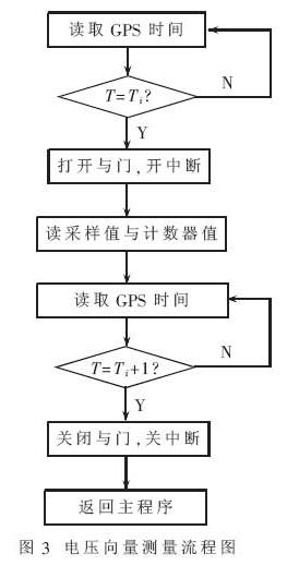 图3为采样子程序流程图。当单片机主程序调用它时,子程序首先读取主从机预约的采样起始时间,在约定起始时间到来时打开与门(单片机输出高电平),同时打开100PPS的中断响应,开始等待下一秒钟GPS的1PPS脉冲信号。其间,系统每个周期采样一次电压幅值和计数器值。在下一秒钟的1PPS脉冲到来时,禁止响应100PPS中断,关闭与门(单片机输出低电平),返回主程序。在不需要采样的时段里,单片机一直输出低电平。其中,Ti是主从机预约的第i个电压向量采集时间。