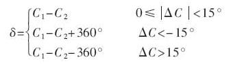第一种情况,首端电压相位超前,此时ΔC<-15°,δ=φ1+φ2=C1-C2+360°;