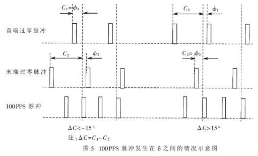 图4为GPS信号及电网信号的时序图。由于电网频率是变化的,电压过零脉冲相对GPS的100PPS时钟的位置也是随机变化的,如图5所示。在计算相位差δ时,当100PPS脉冲发生在δ之外,就是前面已经介绍过的(如图4所示),此时|ΔC|<15°,δ=C1-C2。当100PPS脉冲发生在δ之间需要注意以下情况(相位差值正常情况下不会大于15°):