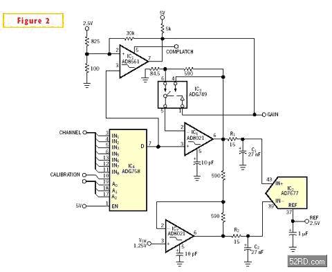 ADC的相对精度通常是指在满度范围被校准的情况下,任意数字量所对应的模拟量实际值与理论值之间的偏差最大值,用相对满度范围百万分比(ppm)表示(也可用百分比,或LSB表示),再加减(±)其系统测量过程引起的最小绝对误差所对应的ppm。图2所示的电路设计能达到107ppm±1.9ppm的相对精度。模拟多路复用器IC4含有多个带宽较小的通道以便利用ADC的1MSPS采样率。因为PGA对多路复用器表现为高输入阻抗,所以可级联多个多路复用器,从而增加通道数。多路复用器还具有一个校准输入端口,从而利用一个校准基准电压就可以简便地校准每次增益设置引起的失调电压和增益误差。校准仅需要在加电或工作条件(例如,温度)发生变化时进行。放大链路由多路复用器、比较器、前置放大器和ADC组成。AD7677具有逐次逼近型结构,它允许放大链路中的单独部分同时工作。当ADC对一个通道进行采样时,其比较器和放大器可以使随后的通道达到稳定。因此,该数据采集系统能以ADC的最大采样速率工作。
