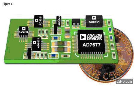 图3示出该电路设计的线性误差。在这种最高增益设置条件下达到如此低的线性误差(图中示出最大值为0.44 LSB,最小值为-0.37 LSB)并非易事。这相当于±0.9 ppm的典型误差。当增益为8时,输出噪声为85 μV rms。如果需要,可以利用软件平均进一步减少噪声。图4示出使用AD7677评估板构成的完整数据采集系统,印制电路板面积为15×30 mm。