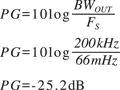 ADC噪声特性通常由热噪声所限制,当选定ADC时,其噪声带宽通常被定义作Nyquist带宽。在fs = 66MSPS时,总噪声底限的测量表示为相对于某一输入信号频率处一个33MHz带宽内全量程(dBFS)的dB值。但是对ADC输出进行过滤后,会产生一个更窄的带宽。滤波过程提供的噪声处理增益是带宽减少量的函数。200kHz 的信道滤波器可获得如下的处理增益: