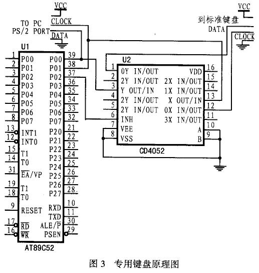 该设计应能保证两个键盘单独工作,而且相互不能影响。因此,不能直接把专用键盘和标准键盘一起接到工控pc的ps/2口。鉴于这种情况,本设计使用模拟开关CD4052并通过时分复用工控pc的ps/2口,来使在同一个时刻只有一个键盘有效,从而解决上述问题。其硬件原理图如图3所示。其中P2口和P1口用于键盘扫描电路(图中未画出),p0.0为数据端,p0.1为时钟端,p0.2为模拟开关选通端。由于专用键盘不需要接收工控pc机的命令,所以软件中并不需要写这部分相应的代码。