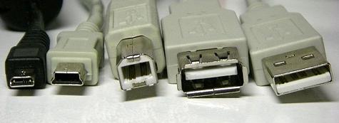 从左往右依次为:miniUSB公口(A型插头)、miniUSB公口(B型插头)、USB公口(B型)、USB母口(A型插座)、USB公口(A型插头)
