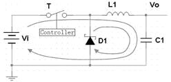 当T关断时,L1通过D1续流,从而电感的电流线性减小,设电感的初始电流为iL1,则则流过电感的电流与时间t的关系: