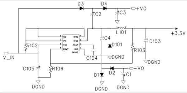 VO的输出电压峰值可达2倍V_IN,-VO的输出电压可达-V_IN。需要注意的是,3路的峰值电路不能超过1.5A,同时两路附加电源的输出功率和必须小于V_IN•I•(1-D),其中I为主输出的电流,D为占空比。在此两路输出电流不大的情况下,此电路可以很好地降低实现升压和负压电源的成本。