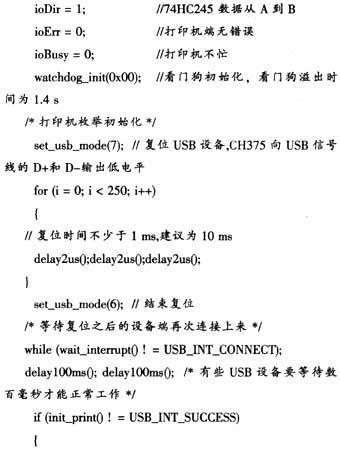 初始化过程分为单片机初始化和打印机的枚举初始化。单片机的初始化过程是直接向相应的I/0口写初始化值及设置看门狗,可调用函数watchdog_init()设置看门狗。
