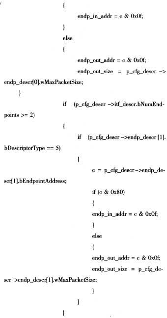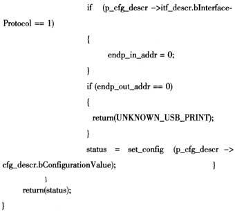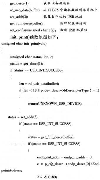 打印机的枚举初始化过程是很重要的,要打印采集到的并口数据首先必须成功地枚举初始化打印机。初始化USB打印机函数init_print()主要使用以下几个主要函数: