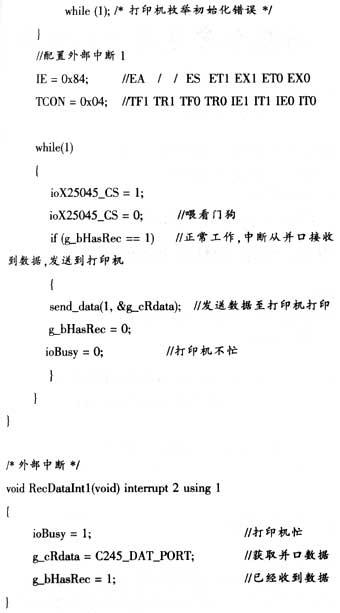 并口数据的采集是通过中断方式进行的。采集数据的控制信号CTRL连接至单片机的中断INT1引脚,通过不断检测INT1的状态进行并口数据的采集。当打印机不忙(BUSY=0)时,如果产生INT1中断,则从74HC245的数据断口读出并口数据,同时将打印机忙标志BUSY置1(表示打印机忙),当数据已经发送至打印机打印时,则将打印机忙标志BUSY置0。然后重复上述步骤进行并口数据的采集及打印。