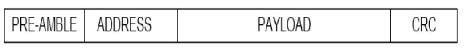 射频模块的无线传输有两种模式:ShockBurstMode和DirectMode,24E1只支持前者,这种技术使用片上的FIFO的方式在 8051MCU与射频模块之间进行数传,保证了较低的数据传输率(10Kbps)和较高的数据发送速率(可达1Mbps),从而节省了能量。数据在空中传输的帧格式如下: