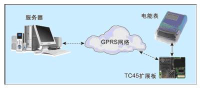 系统由多功能电能表、TC45模块扩展板和服务器端组成,如图3所示。扩展板电路向客户开放。TC45模块的串口2经光隔离RS485接口与电能表连接,实现了抄读等数据通信和对电能表的智能控制。具体实现:模块接收服务器端通过GPRS网络传达的数据,经过分析,相关查询指令通过串口2传输给电能表,电能表接收到查询命令后,反馈回相关的信息,然后经过模块的分析校验以及相应的处理后,回送到服务器端。模块的通用I/O接口通过中间电路,实现继电器拉闸和报警等智能处理。一旦有断电、超温等报警事件发生,TC45端将作相应的事件记录,然后向服务器发出相应的报警信息。