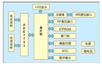 本文介绍的方案的电能计量芯片选用美国ADI公司的ADE7753。ADE7753集成了2路16位Δ-ΣADC、高性能DSP、电压基准及温度传感器等电路,在1000:1动态范围内误差小于0.1%;提供有功、无功及视在电能、电压、电流有效值及波形采样等数据;功率、相位及输入失调可实现数字校准;在环境条件变化很大和长时间使用条件下,采用专利技术的ADC及DSP仍能保证高精度。实时时钟(RTC)选用EPSON公司的RX8025,单片机每隔一段时间根据环境温度的变化对RX8025的内置晶体进行补偿,以实现高稳定高精度的实时时钟。