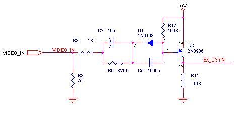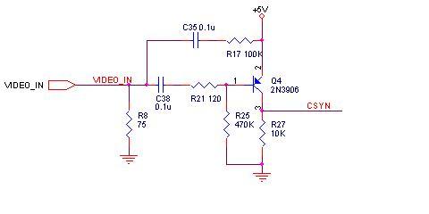 原理都相同,用比较大的电容两端积累的直流电压,分离相对直流电平点变化较大的同步头。这个电路大胆用104电容代替电解电容,也工作得很好,体积大大减小了,不过后来发现负载变化较大时不够稳定,CSYN输出有杂波。这里最需要调整的是偏置电阻R25。最后应用中,要么后面加一级三极管放大,对信号整形,排除未到TTL电平的杂波;要么前面加一级射随,隔离负载变化的影响。