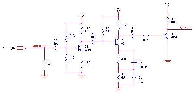 够麻烦的,两个电源,先反相,再按电容放电时间长短的原则,C2保持的电压使三极管Q2只在同步到来时导通,后面还要一级放大才出来TTL电平,不过工作得很好。这个电路当时是用OrCAD SDT3.34画的,文件现在都转换不过来了,只能重新画一次。