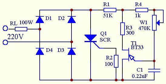 可控硅交流调压器由可控整流电路和触发电路两部分组成,其电路原里图如下图所示。从图中可知,二极管D1—D4组成桥式整流电路,双基极二极管T1构成张弛振荡器作为可控硅的同步触发电路。当调压器接上市电后,220V交流电通过负载电阻RL经二极管D1—D4整流,在可控硅SCR的A、K两端形成一个脉动直流电压,该电压由电阻R1降压后作为触发电路的直流电源。在交流电的正半周时,整流电压通过R4、W1对电容C充电。当充电电压Uc达到T1管的峰值电压Up时,T1管由截止变为导通,于是电容C通过T1管的e、b1结和R2迅速放电,结果在R2上获得一个尖脉冲。这个脉冲作为控制信号送到可控硅SCR的控制极,使可控硅导通。可控硅导通后的管压降很低,一般小于1V,所以张弛振荡器停止工作。当交流电通过零点时,可控硅自关断。当交流电在负半周时,电容C又从新充电……如此周而复始,便可调整负载RL上的功率了。