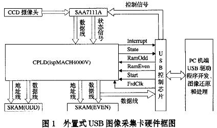 在PC机端,通过USB发出图像采集命令后,FPGA/CPLD进行图像采集,由于CCD 摄像头输出模拟信号,需要经过视频A/D转化睛,把模拟视频信号转化成数字视频信号,输入进FPGA/CPLD芯片,FPGA/CPLD根据状态信号 RTS0把奇偶场图像信号分别存储在SRAM(ODD)和SRAM(EVEN)中。
