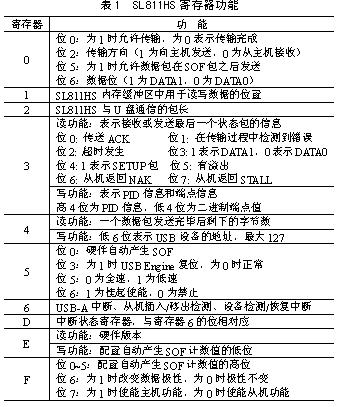 SL811HS共有15个配置寄存器,其中0~4、8~C是USB-A、USB-B的工作配置寄存器,5、F是控制寄存器,6是中断使能寄存器,D为状态寄存器,E、F为SOF计数寄存器。各个寄存器的具体功能如表1所列。