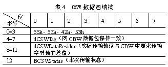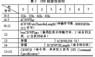 根据USB的协议规范,所有的传输都须由主机启动。即主机首先向设备的OUT端点发送一命令(CBW数据包),请求传输,格式如表3所列。