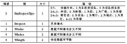 在设备检测阶段,主要通过setup结构的数据包(8字节长)向USB设备的控制端点0(默认端点)发送命令。数据包结构如表2所列。
