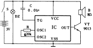 10.配乐动感风景灯光挂画该制作采用流水声加鸟鸣声模拟集成电路,可制作生产配乐动感风景灯光挂画。这种美化家居、回归自然的现代装饰画,一经问世就大受消费者的欢迎。图13是配乐动感风景灯光挂画电原理图。接上220v交流电源,经电容c降压,d1、d2半波整流稳压,电容c2输出3v直流电压,ic开始工作。由于触发端tg常接vcc端,所以扬声器b一直有节奏地发出潺潺流水声和小鸟清脆悠扬的鸣唱声。与此同时,220v交流小电机dj旋转工作,带动齿轮装置使云彩和流水的背景画面产生移动效果。这种呈现一幅亦真亦幻微缩自然景观的声光动感画,对于现代都市家居来讲,无疑增添了一道亮丽的风景线。文章来源----中国家电维修110网