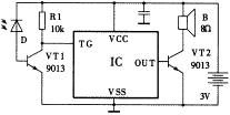 9.超响度贵重物品报警器图12是应用于贵重物品被盗报警器的电路原理图。该电路简单、制作容易、实用性强,厂商若能开发成小产品,与贵重物品如珠宝首饰等配套供应,说不定还能开拓一条招徕顾客的新途径。图12中的s为一开关,平时受压力作用,s处于断开状态。当被保护物品被人移动时,s闭合,ic立即工作。该电路音频输出端out接变压器t(可采用小型晶体管收音机输出变压器,将次级原接8Ω扬声器端接ic的out端与vcc端,初级则接带助音腔的压电蜂鸣器b),从而使蜂鸣器b发出洪亮急促的警报声。