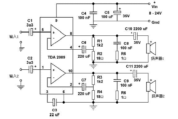 c1、c2为输入电容,c10、c11为输出电容。c6、c7为反馈电容。r1/r2或(r3/r4)控制反馈量。放大器的增益等于1+(r1/r2)=68或37db。c4、c5为电源滤波电容。该装置最大电源电压为28v。工作时tda2009a需加散热片,并应注意电源线和接扬声器接线的选择。输入端应选用屏蔽线并尽可能的短。焊接tda200a时注意时间不要太长,动作要快,但要让其充分与电路板融合。