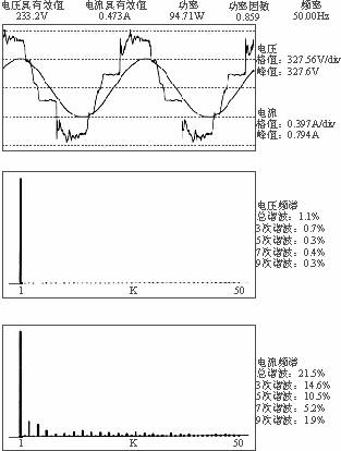 图4 350V/10A 电源在加载400W 后测量打印的电网输入波形、电流频谱(省略了电压频谱)