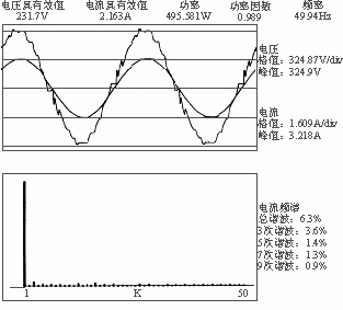 表1 及图3 分别给出了一台350V/10A 电源在空载恶劣条件下,仪器测量打印的数据和波形。图4 给出加负载400W 之后测量打印的电网输入电流、电压波形,功率因数值,频谱特性等。