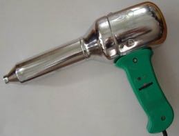 - 热风枪这是拆多脚的贴片元件用的,也可以用于焊接。买专用的比较贵,可能要一、二百元以上,国内有一种吹塑料用的热风枪(下图左边),只售五、六十元,很多卖电子元件的店都有卖,很合用。我测过它吹出热风的温度,可达400 – 500 度,足以熔化焊锡。