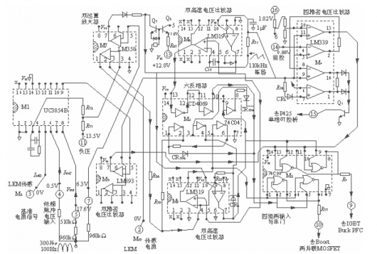两种3500W 电源主板上完全相同的PFC 控制板电路,它的奇特之处在于:其主芯片UC3854 只利用了内部电路的前半部分,即线性模拟乘法器和电流误差放大器等;而其他重要的单元电路,如高频振荡器、PWM 比较器、R-S 触发器、逻辑控制电路和开关脉冲预放大驱动器,却反常地留给了PFC 控制板上其他IC(LM319,LM339,LM358 和LM393,74C00,74C04 等共7 只)来分别完成,设计者独辟新路,是为了扩大主芯片控制范围。