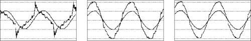 当48V 电源加载到440W 后,其市电输入电流波形明显转好,相位偏离也减小,敏感的电流总谐波降至15%,功率因数值大幅提高到0.958,虽然它接近350V 电源加载到400W 后的PF=0.989,但细看比较48V 电流波形,显然台阶突起仍多尖,不如前者更接近正弦波形,且350W 电源的加载后电流总谐波又显著减小到6.3%。当48V 电源再加载到942.8W 时,其电流波形也进一步改善为小台阶,电流总谐波又降至7.1%,PF=0.987。当48V 电源加载到1385W 时,输入电流波形才接近正弦波,PF=0.995,电流总谐波降到4.0%。(见图10,图11,图12 与表2)。
