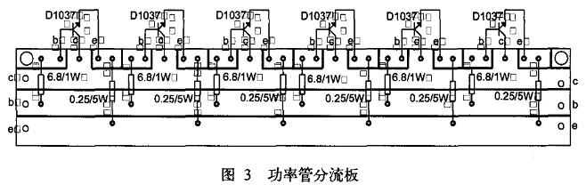 由于本功放板简而又简的走线,很容易手工制作。笔者用刻刀制作底板线条并在焊点上钻Φ1.2mm孔,用内径Φ0.8mm铜铆钉焊好,使本电路板这一技术载体成为了一项“纯土炮”级制作,而可双面焊接、反复焊接不会损坏电路板,为反复调整更换元件带来极大方便。两块“纯土炮”功放板如图2所示,4条功率管分流板如图3所示。元件参数列于附表。只要按图施工,零件合格,百试百灵,无任何可调电阻。