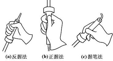 反握法的动作稳定,长时间操作不易疲劳,适于大功率烙铁的操作;正握法适于中功率烙铁或带弯头电烙铁的操作;一般在操作台上焊接印制板等焊件时,多采用握笔法。