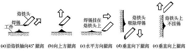 烙铁的撤离要及时,而且撤离时的角度和方向与焊点的形成有关。如图所示为烙铁不同的撤离方向对焊点锡量的影响。